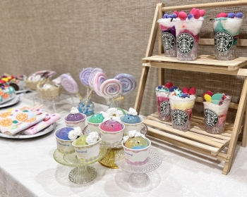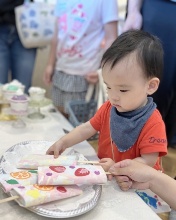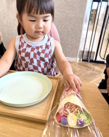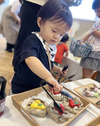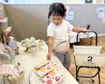 まるで本物のようなスイーツを作り、お買い物ごっこをする中で、「わたしがつくったのこれ!」と、パパやママに紹介し「おいしそうだね」という会話に花が咲いていました🌻