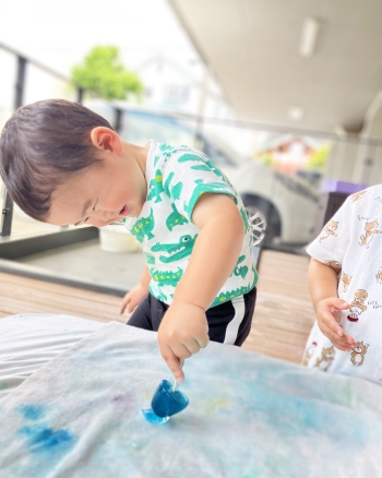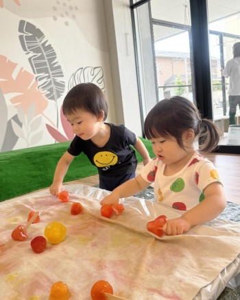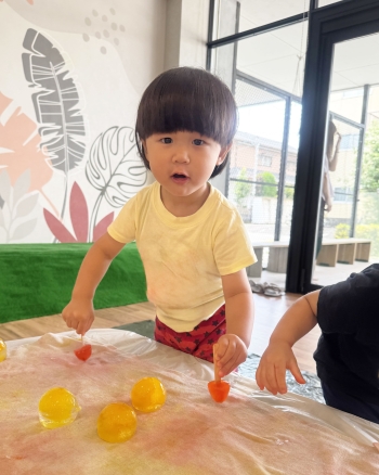 氷が溶けて布が色付くことに気がついたり、氷の色が手に染まると不思議そうな表情をし、興味津々の子どもたちでした。☺️
