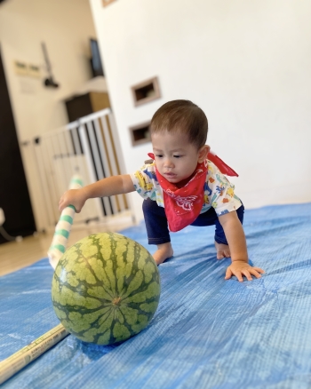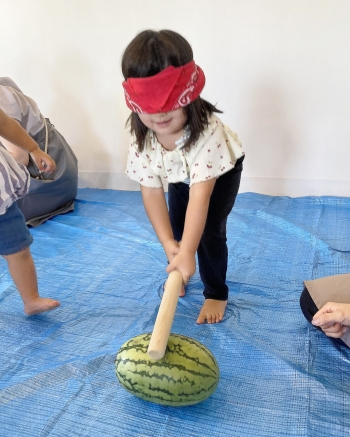 一人ひとり、棒を握って順番にスイカを狙って力いっぱい叩いたり、「がんばれ~!」「こっちだよー」とお友だちを応援し、大盛り上がり♫