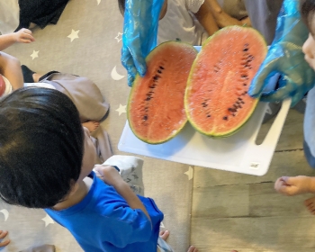 大きなスイカに「うわ~!」「なにこれー!」と目をきらきら輝かせる子どもたち✨