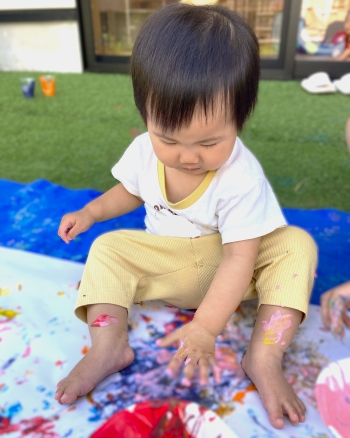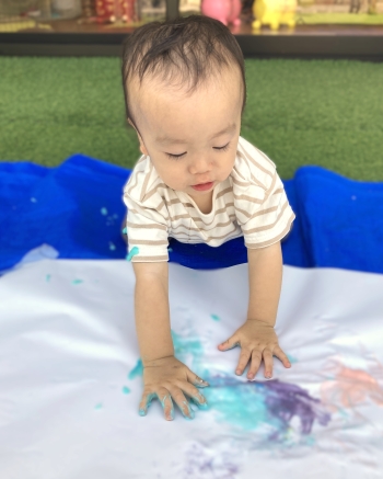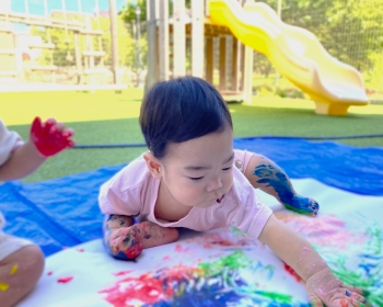 今回は美育活動で小麦粉絵の具を使ってフィンガーペインティングを行いました!