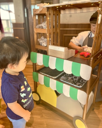 パン屋さんごっこから、食べ物を売る移動販売車へと関心を持っていた子どもたちは、今回のキッチンカーと結びついたことで、興味や関心がさらに広がっているようでした。
