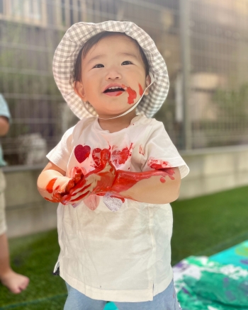 青空の下、園庭を使ってボディペイントを楽しみました。