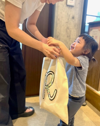 フィンガーペイントで模様をつけた自分のイニシャルをアイロンで転写し、オリジナルバックに入れてお届けをしました。