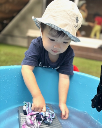 泡の匂いを嗅いで「良い匂い!」と感じたり、ゴシゴシと汚れを落とす感覚を楽しんだりしながら、綺麗になったことを喜ぶ姿が見られました。