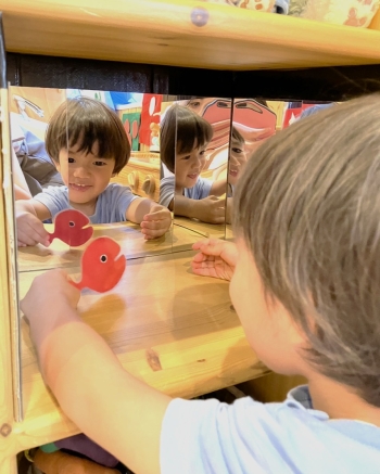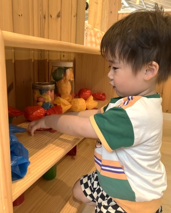 おもちゃ棚に鏡が貼ってあったりいつもと違う物が置いてあったり、