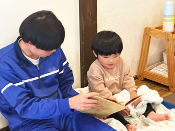 戸外に行く際には一緒に手を繋いでもらい、午睡前には絵本を読んでもらうなどお兄さん先生、お姉さん先生との交流を深めることができ、大喜びな子どもたちでした!