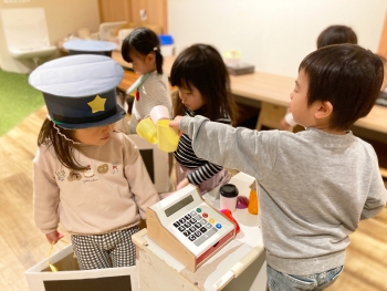 子どもたちが成長や発達に伴い、見立て遊びや模倣あそびがとても上手になってきたことから、お買い物ごっこができるレジや携帯電話、お人形をお風呂に入れて遊べる物グッズなど新たに保育室に取り入れました😊