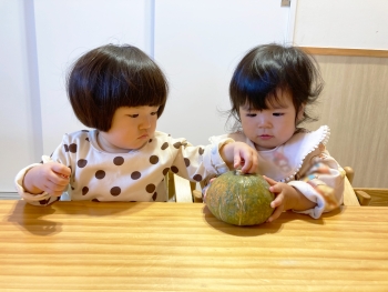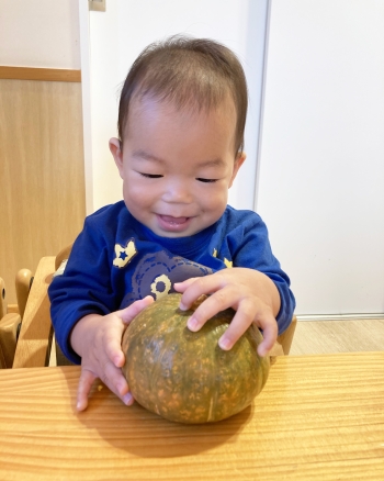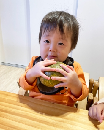 初めてかぼちゃに触れたため、恐る恐る触ったり興味津々な様子で手を伸ばしたりする子どもたち👐🏻