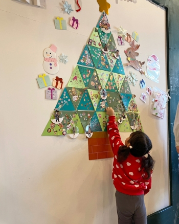 制作で作った壁面のクリスマスツリーに、自分の写真が入ったオーナメントを飾りました。