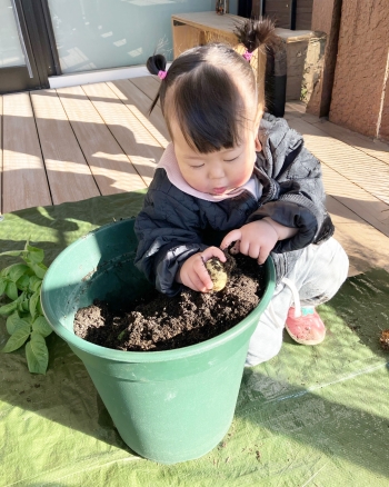 とドキドキしながらも楽しみにする姿が見られ、土の中からじゃがいもが顔を出すと嬉しそうに