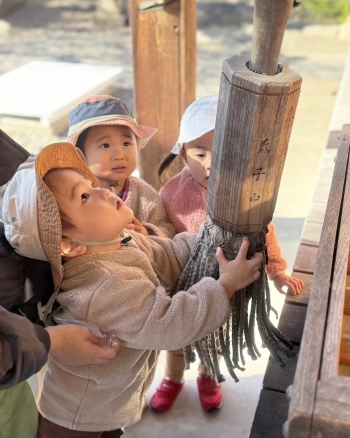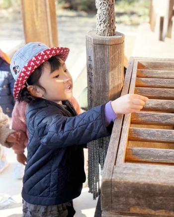 お賽銭を入れたり、鈴を鳴らしたりと、少し緊張しながらも保育者の真似をしながら真剣な表情を浮かべていました。