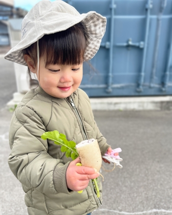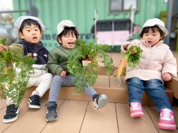 小さな手で土に触れ、野菜をそっと引き抜く子どもたち。