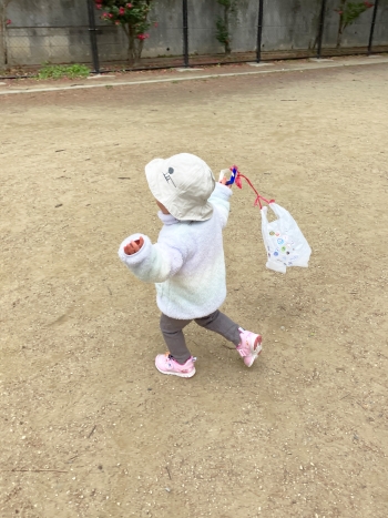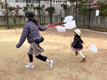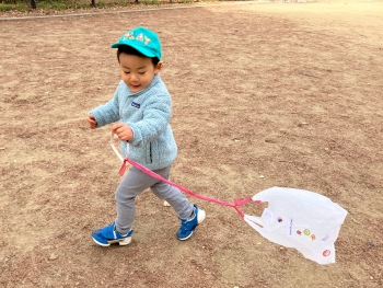 遊びが発展していくと、保育者が持つ凧を捕まえようと必死に追いかける姿も…☺