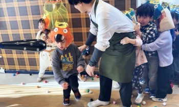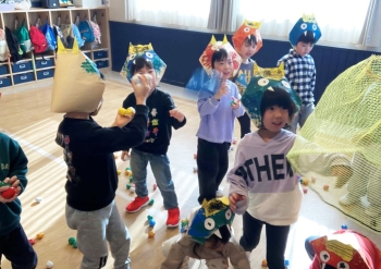 心の中にいる“悪い鬼”をやっつけるため、子どもたちは節分に向けて楽しく豆まきの練習をしてきました。