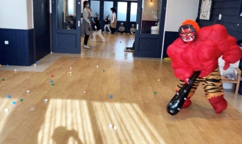 怖がりながらも勇気を出して豆を投げて戦う子、保育士の後ろに隠れる子、思いきり走って逃げる子など、反応はさまざま。