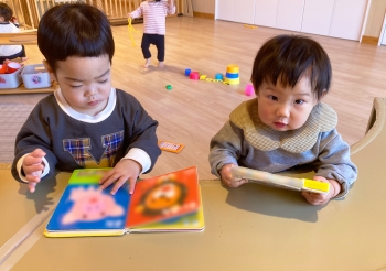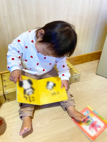 保育者の絵本の読み聞かせや、本棚から好きな絵本を選んで自由に見ることを楽しんでいます😊