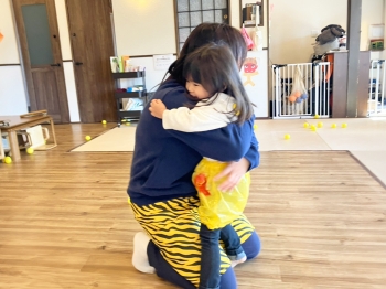 豆に見立てたカラーボールを投げて鬼を退治し、大好きな先生を助けることができました!